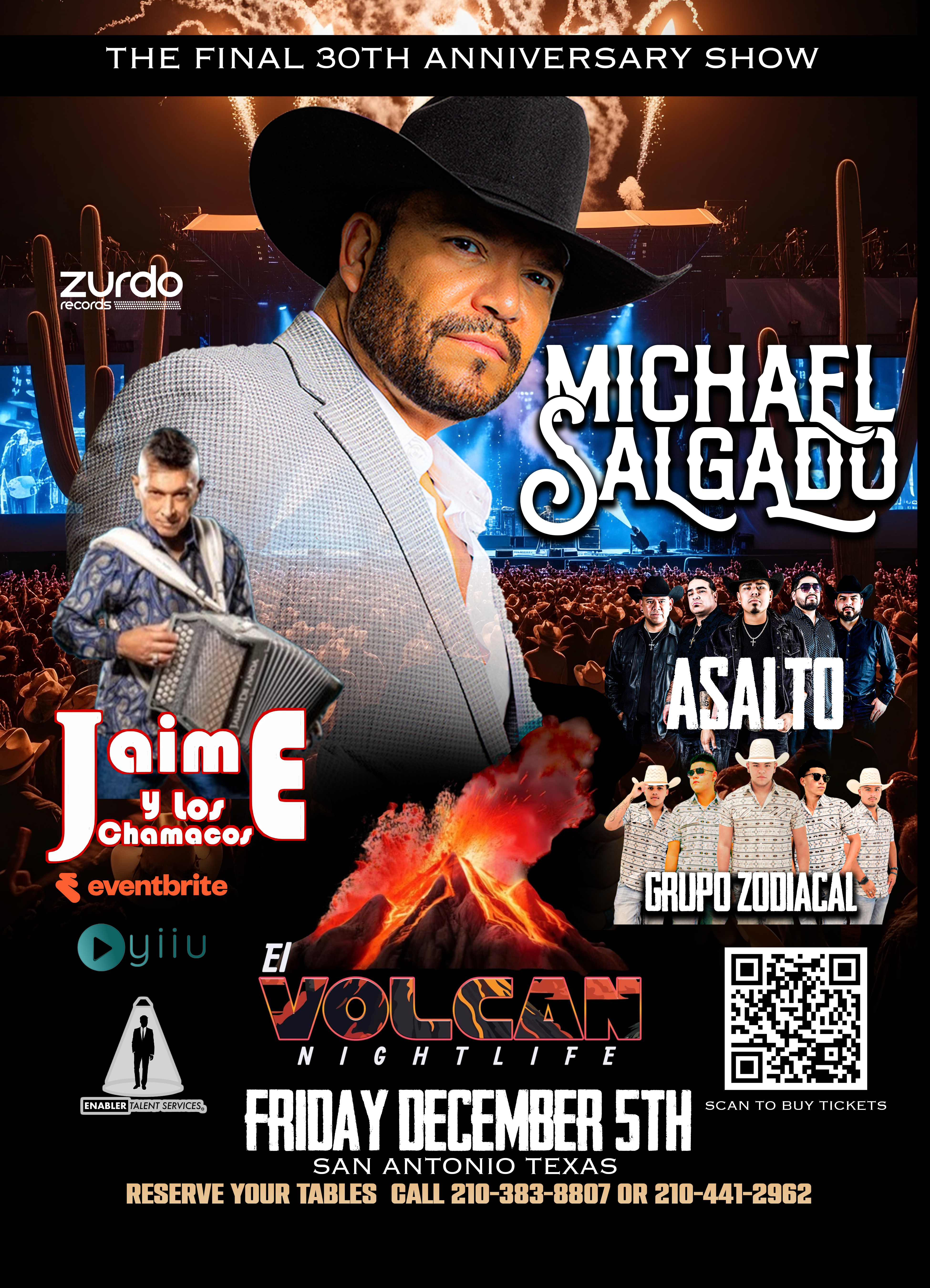 THIS EVENT HAS MOVED LOCATIONS BEYOND OUR CONTROL: NEW LOCATION : "EL VOLCAN "6844 Ingram Rd, San Antonio, TX Michael Salgado Celebrates his 30th Anniversary LIVE IN SAN ANTONIO TEXAS DECEMBER 5TH! SPECIAL GUEST Jaime Y Los Chamacos Asalto Grup Zodical A Anight you WONT FORGET ! GET TICKETS NOW ! PRICING SUBJECT TO CHANGE DAY OF THE EVENT !